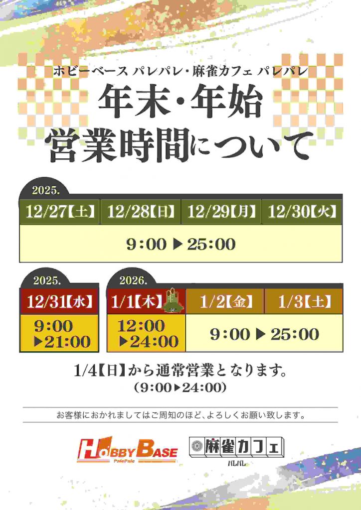 2025.12.26 最終更新日時 : 2025.12.24 パレパレ 田宮店 年末年始営業時間のお知らせ 12月27日~12月30日、1月2日~1月3日…9:00~25:00 12月31日…9:00~21:00 1月1日…12:00~24:00 ご来店お待ちしております。
